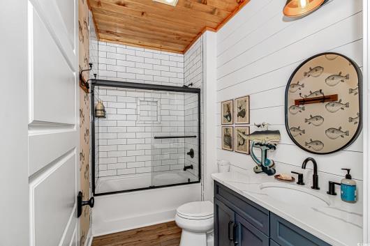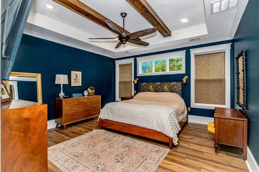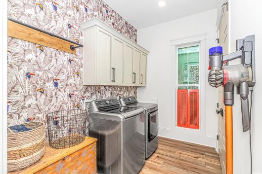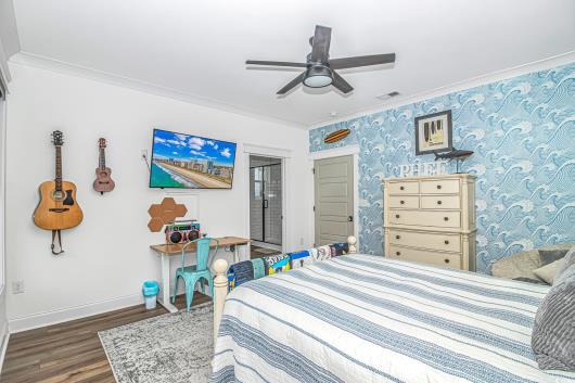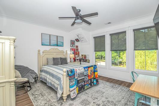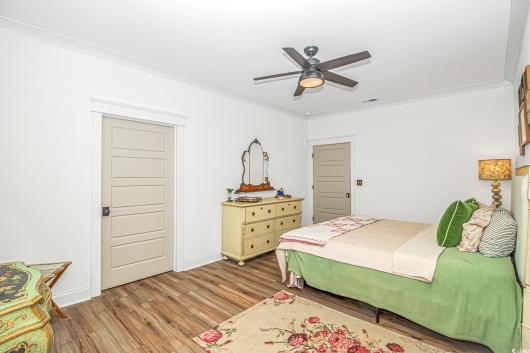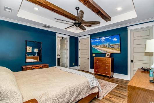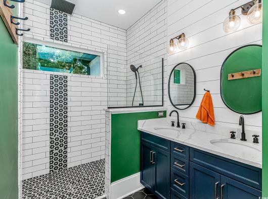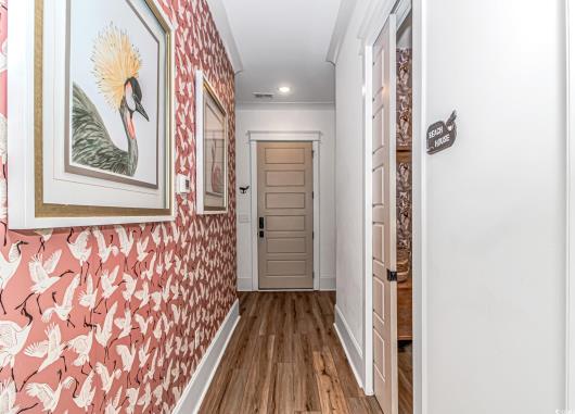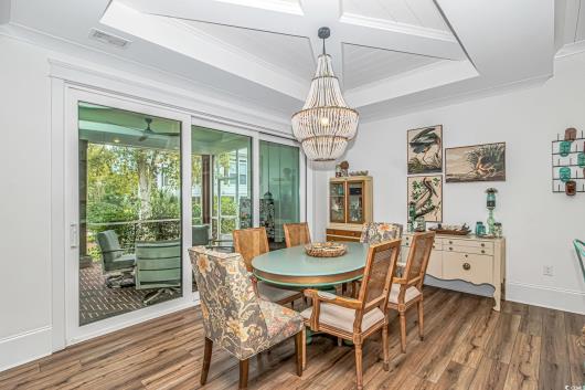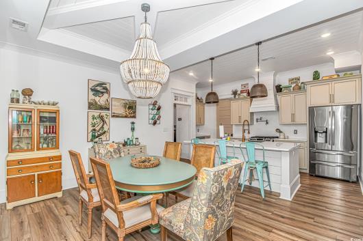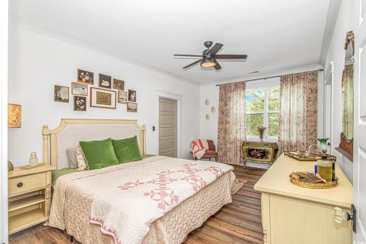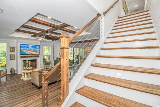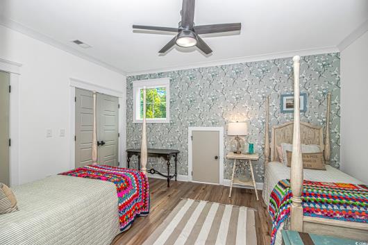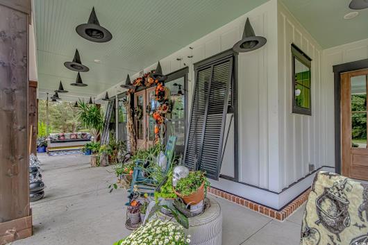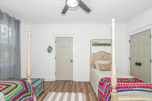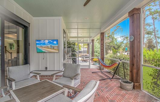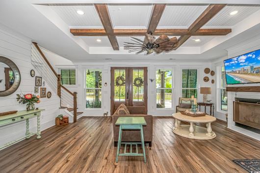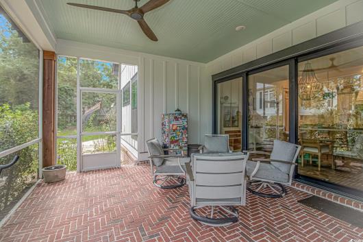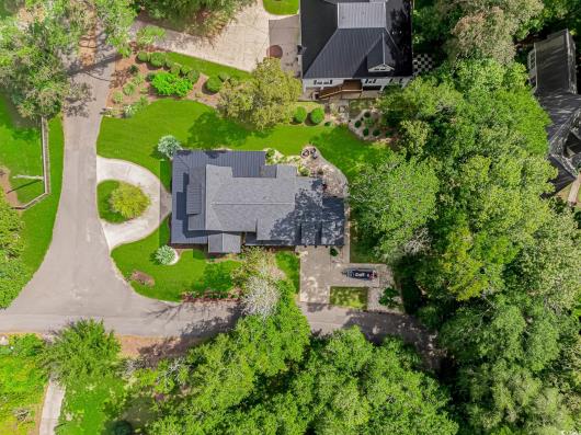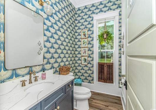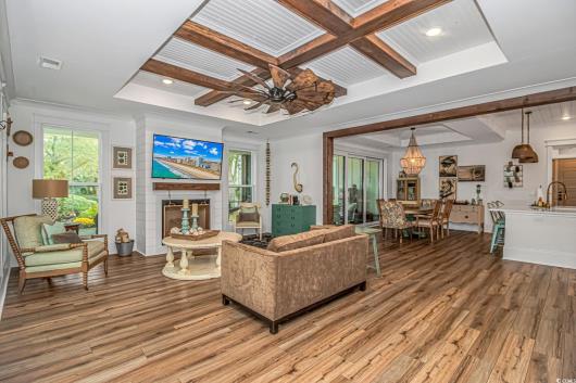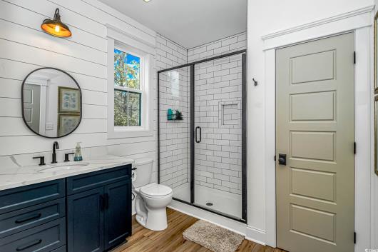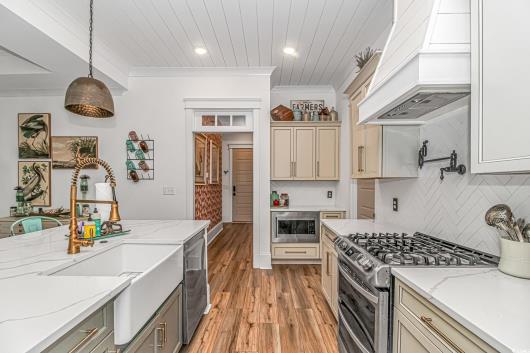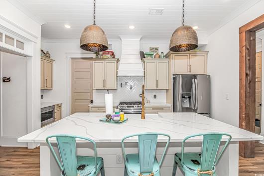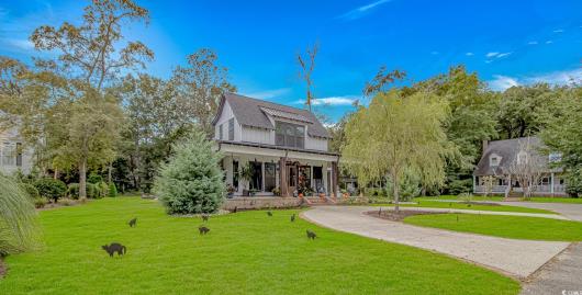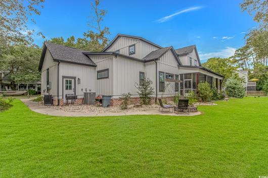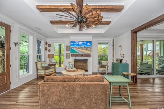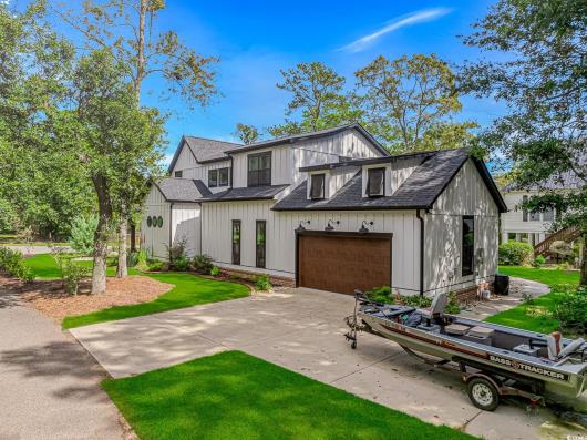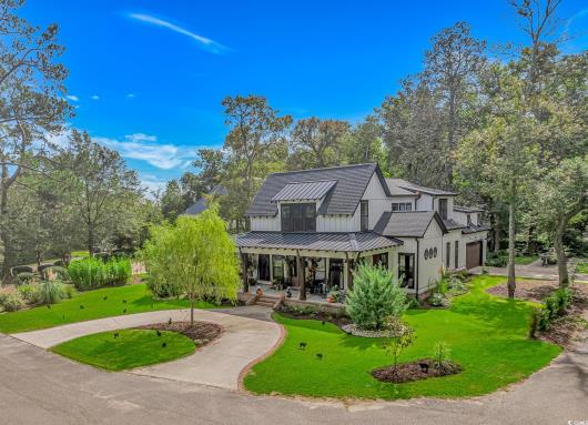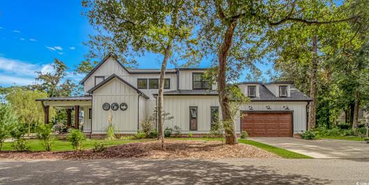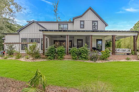 Nestled east of Highway 17, this Southern custom coastal farmhouse exudes charm and elegance. The home features four spacious bedrooms and 3 1/2 baths, perfect for family living and entertaining guests. A circular driveway welcomes you to this beautiful property, setting the stage for the warmth and sophistication found inside. Enter through 8-foot solid wood doors into the open floorplan, designed for modern living, with a seamless flow between the living spaces. The heart of the home is the kitchen, boasting double ovens and a gas stove, ideal for culinary enthusiasts. Adjacent to the kitchen is a large laundry area, adding convenience to daily chores. Steps away, you will find the primary suite featuring a truly luxurious ensuite. Double vanities, water closet, and a tiled shower featuring a rain head and two additional sprayers for the best start to your day. Solid surface countertops and tiled showers throughout the home reflect quality craftsmanship and attention to detail. The living room is enhanced by a coffered ceiling and a cozy fireplace, creating a welcoming atmosphere. Step outside to the large screened-in porch, complete with brick flooring, perfect for enjoying the coastal breeze and relaxing outdoors. This home combines Southern charm with modern amenities, making it a true coastal farmhouse dream.