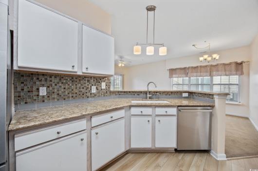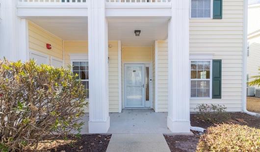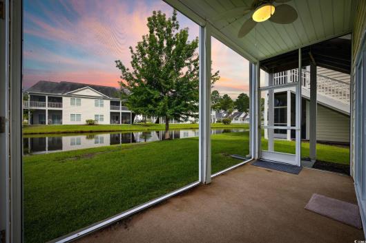 Move In Ready! First-floor! End-unit! Carolina Forest Condo living at its best! This bright, spacious, and meticulously cared-for 3BR/2BA condo in Windsor Green at Carolina Forest is looking for new owners. Offering an open layout with a smart split-bedroom design and a serene screened porch overlooking a peaceful pond, this home checks so many boxes. Attractive LVP flooring in the foyer leads to two well-sized guest bedrooms, each with ceiling fans. One features its own walk-in closet and LVP floors. The nearby full bath offers LVP flooring, a comfort-height toilet, and a tub/shower combination. The kitchen is filled with natural light and includes stainless steel appliances, granite countertops, pendant lighting, abundant cabinetry, and a breakfast bar. A separate laundry room sits just off the kitchen and comes complete with a full-size washer and dryer, plus a roomy storage rack. The living and dining areas sit between the guest rooms and the primary suite, and this end-unit’s extra windows, along with the double sliding doors, flood the space with sunlight. Both the living room and primary bedroom enjoy pond views and direct access to the screened porch. The primary suite also features a spacious walk-in closet and an ensuite bath with linen storage and a tub/shower combo. An additional outdoor storage closet is located on the front porch. Windsor Green offers an outdoor pool, playground, recreation center, and beautifully maintained grounds. This community is ideally situated near Tanger Outlets, local and national dining options, golf courses, and walking/biking paths along the boulevard. Just a short drive to the beach and MYR airport. Whether you’re seeking a coastal getaway, a primary home, or an investment opportunity, this condo is a standout. Book your private showing today! **Some photos virtually staged or digitally altered.**